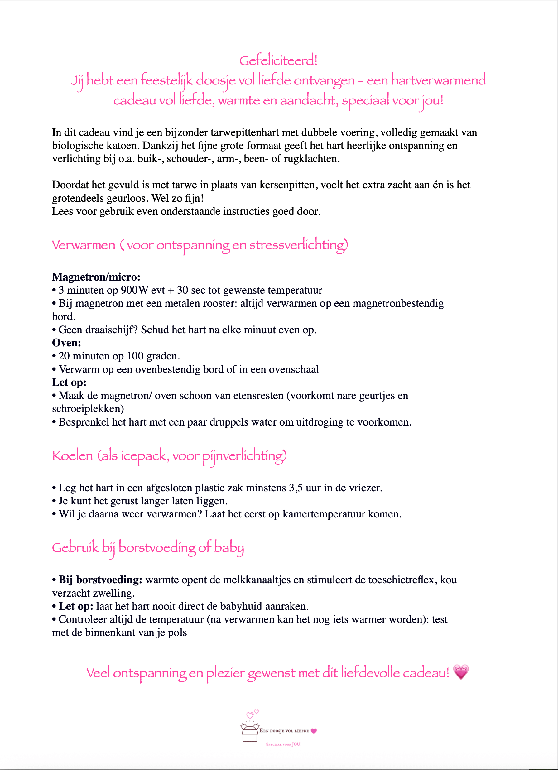 • Een prachtig XL tarwepittenhart  – te verwarmen, verkoelen of gewoon mooi ter decoratie.