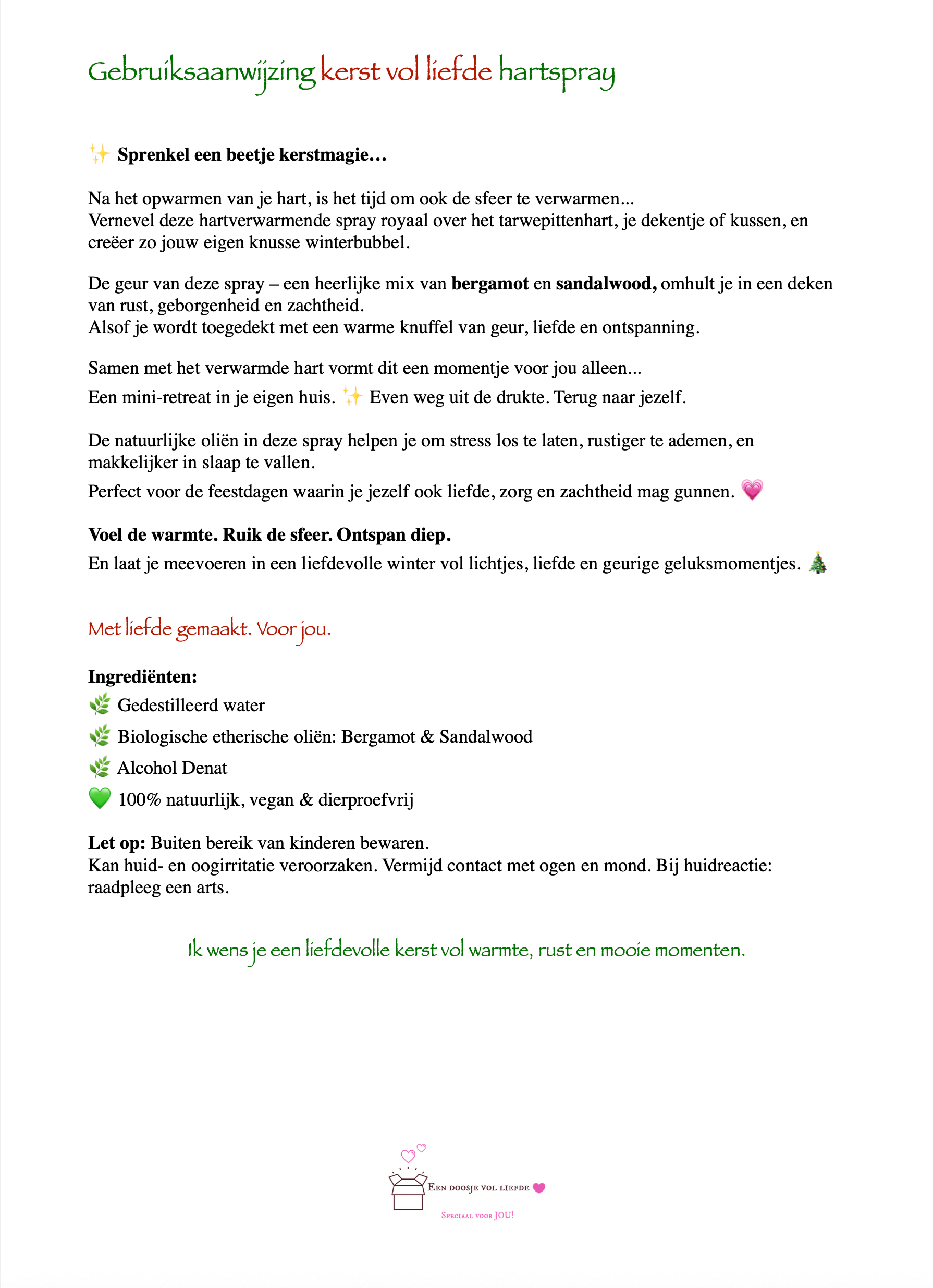 💧 Een verstuiver van 20 ml “Kerst vol warmte & liefde” hartspray – 100% natuurlijk.