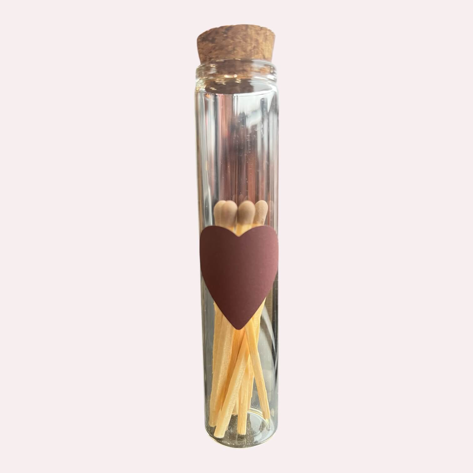 Erbij zit een glazen buisje gevuld met gouden en roze lucifers, mét een hartje waarop je ze kunt aanstrijken.
