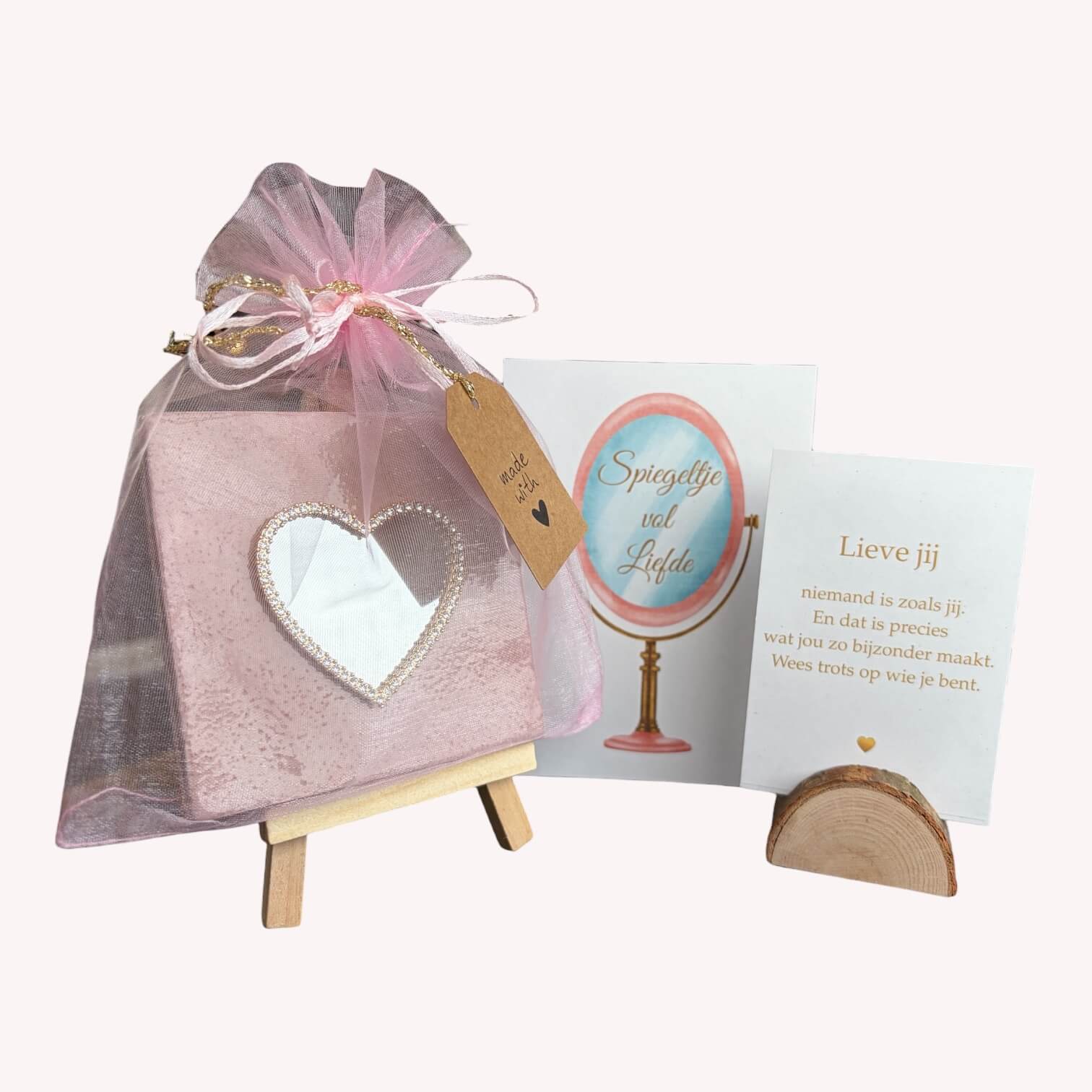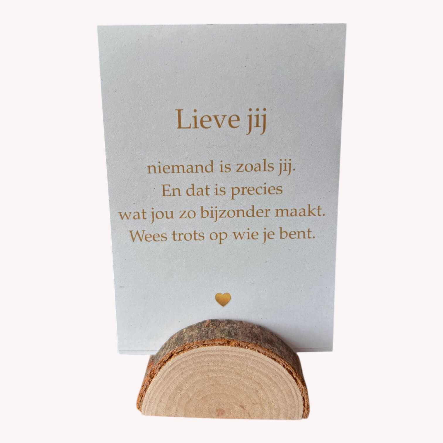 ⢠een fluisterkaartje met liefdevolle woorden, in een natuurlijke halfronde boomstamhouder